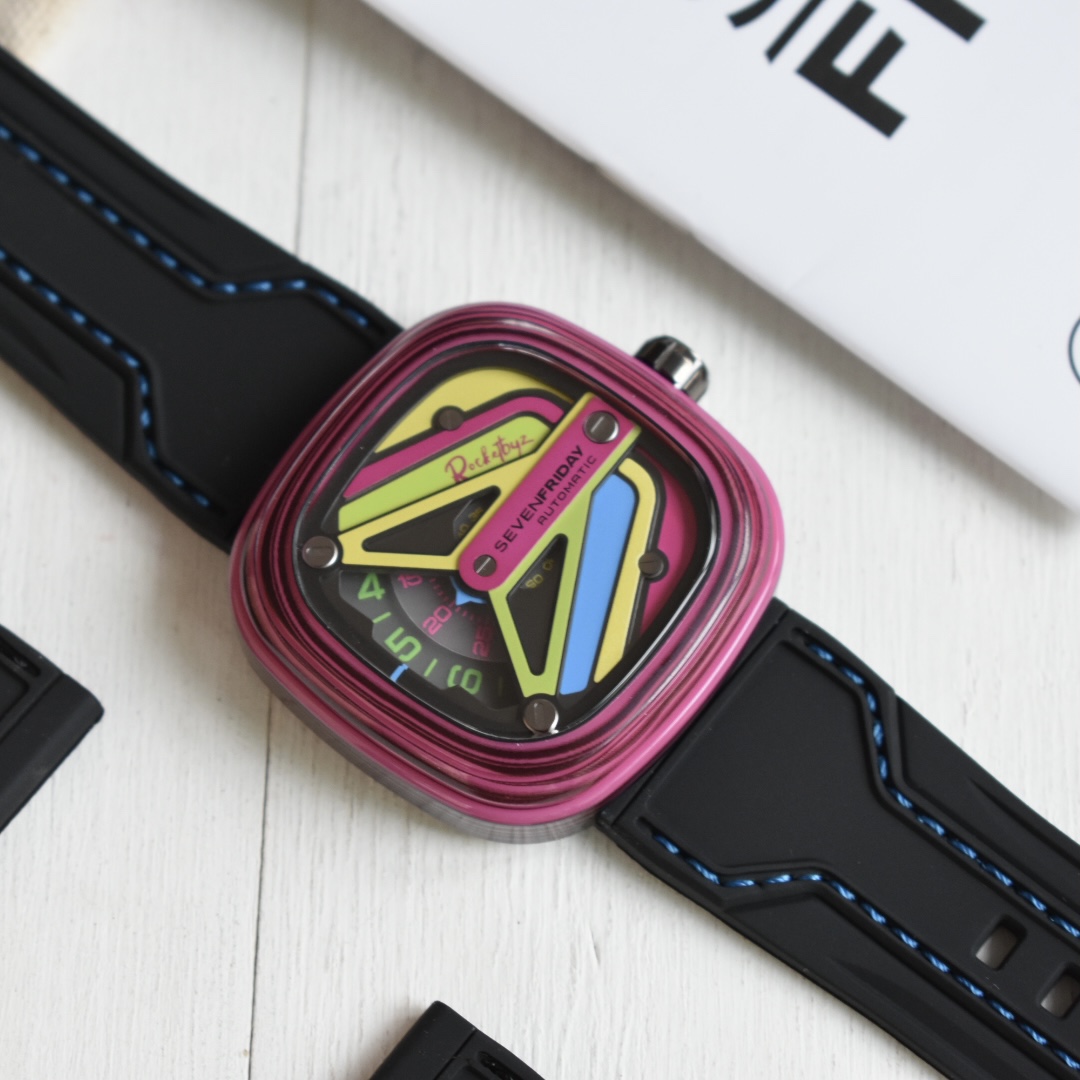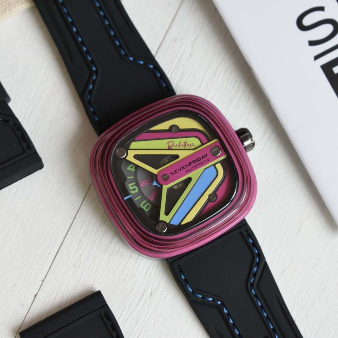 sevenFriday携手Rocketbyz工作室打造的2020年最新第二代联名款SF-M3,将地下文化中纷繁浓郁的荧光色彩元素融入腕表中,整表有由表壳,表圈,表壳动态环,锁螺丝底盖组合而成,整个表盘用色彩来表达自我,绝对的个性潮人必备,男女都合适佩戴 ,30米防水防 ,支持NFC验证 ,原装正品西铁城自动机械机芯8215 40小时的动能存储,配原厂全套包装。