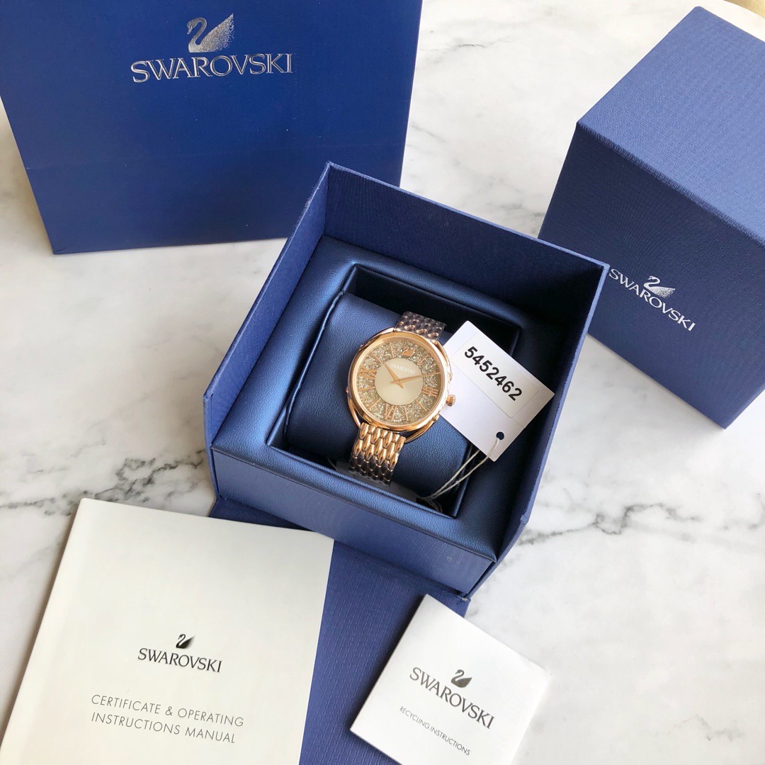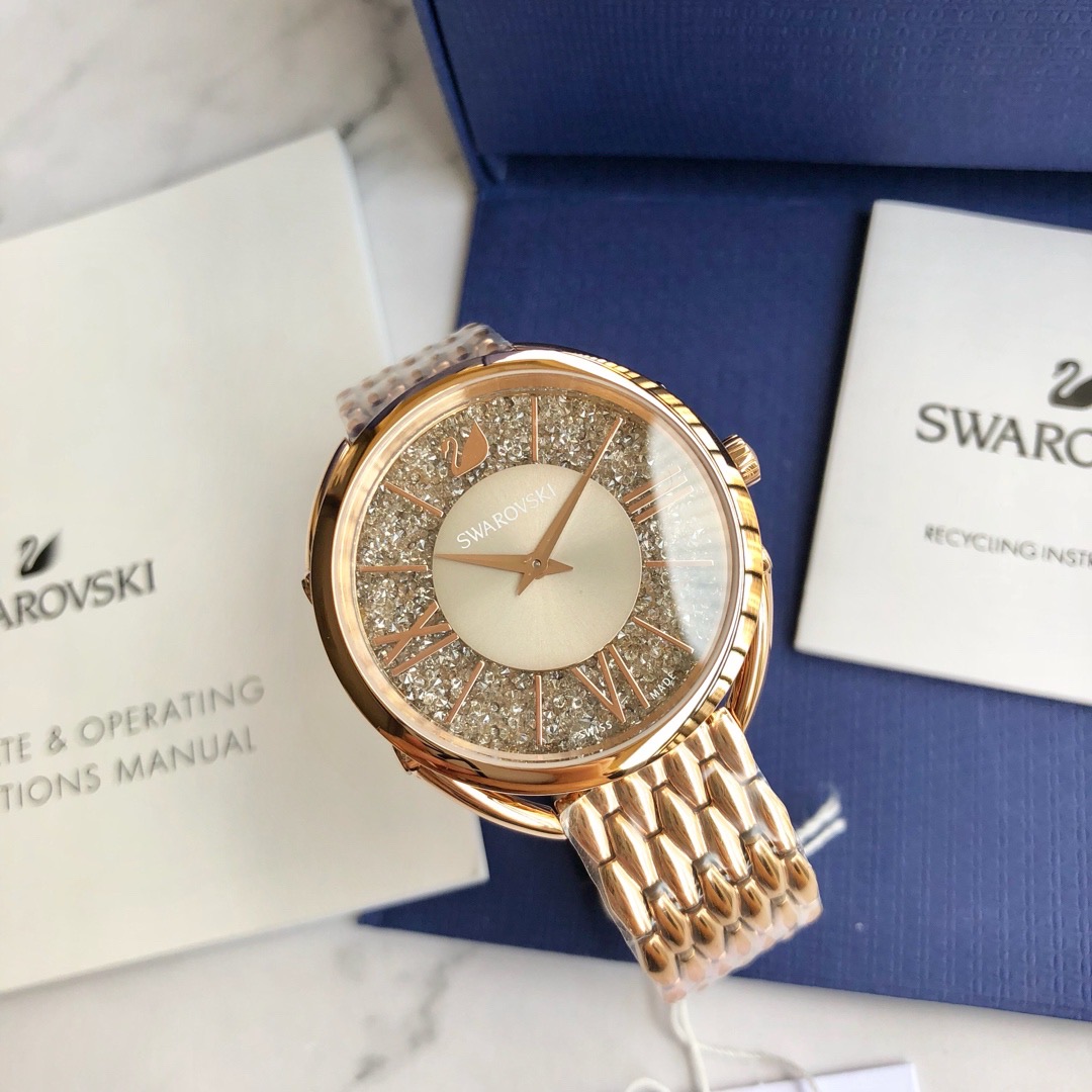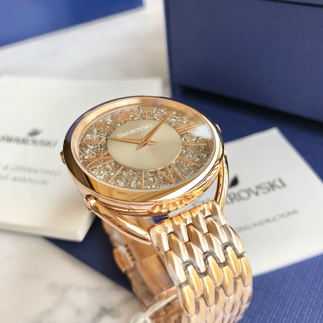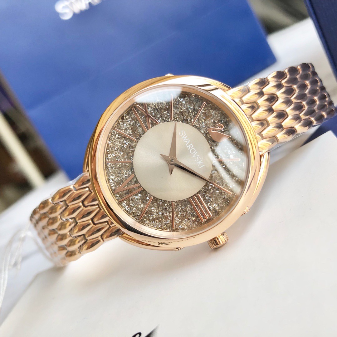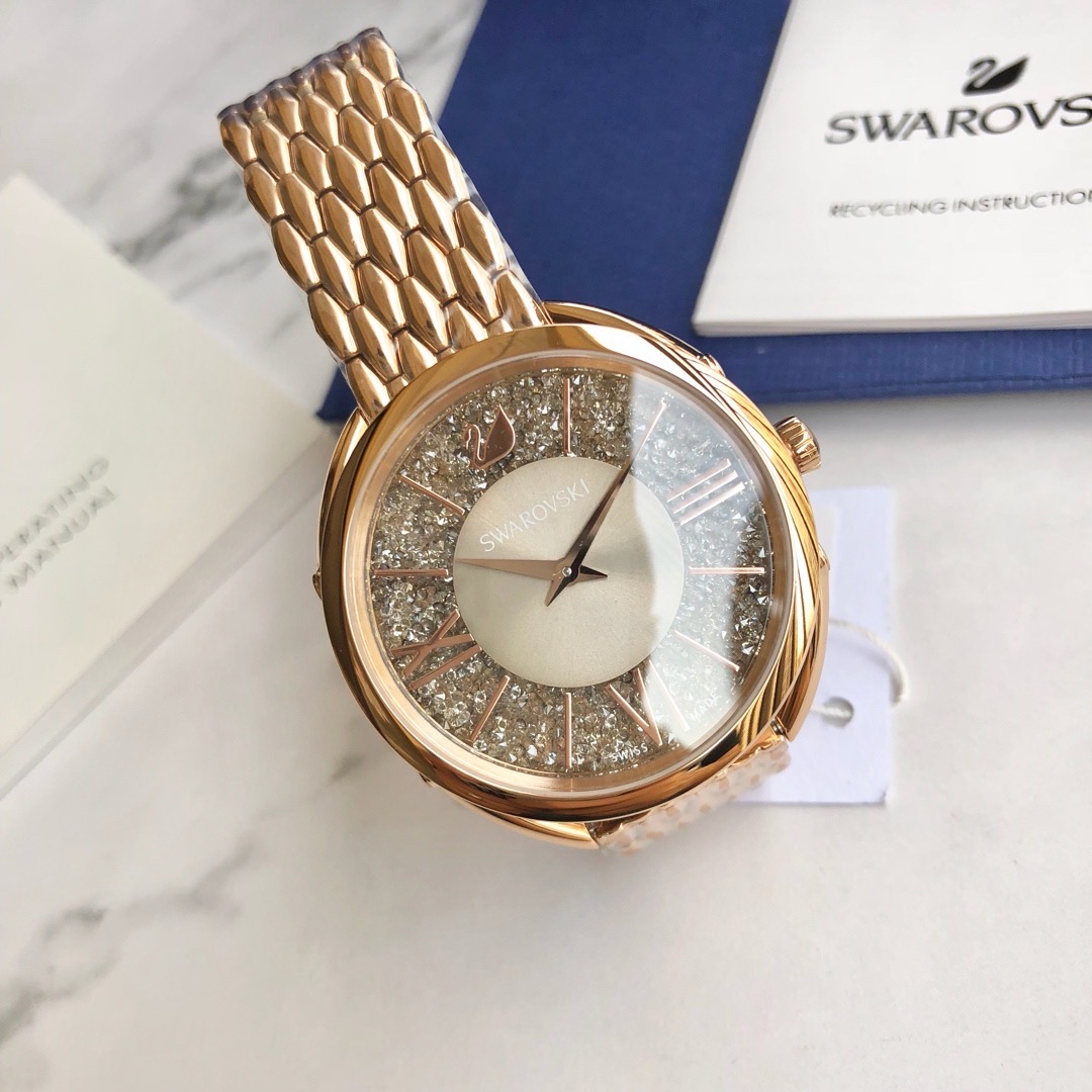 施华洛世奇Crystalline Glam 系列,精致优雅的黑色图纹表盘上镶有800多颗璀璨迷人的灰色水晶,搭配玫瑰金罗马数字刻度以及不锈钢金属表链,适合日常装扮增添闪亮魅力的时尚女性;