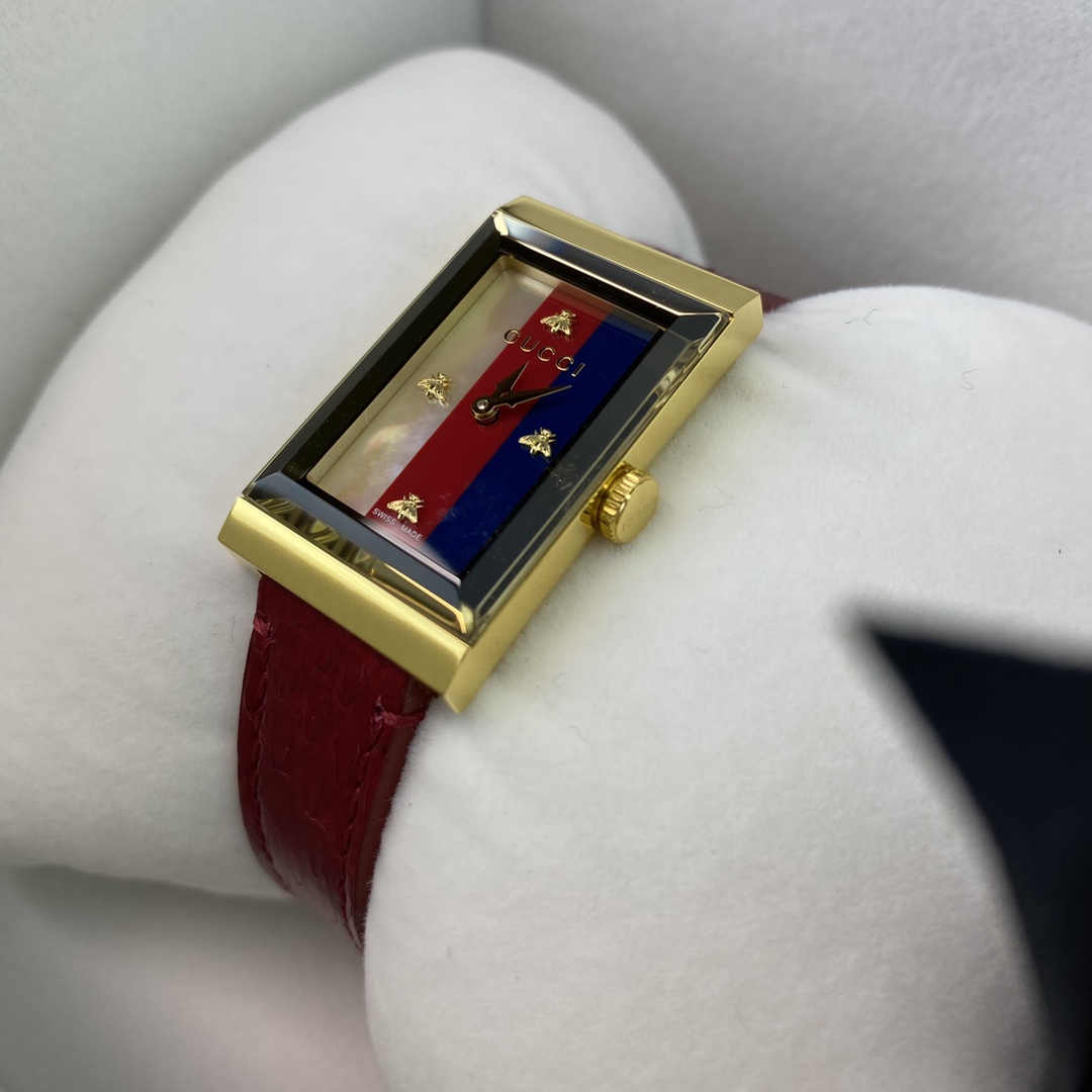 GUCCI古驰正品手表欧美潮牌石英时尚复古条纹潮流女表 !古驰方型的款式不算多,这是其中最为经典的作品, 蟒蛇皮表带,珍珠贝母条纹拼接表盘,镶嵌立体雕刻的小蜜蜂!瑞士进口石英机芯,走时精准!30米防水设计,完全满足日常需要!