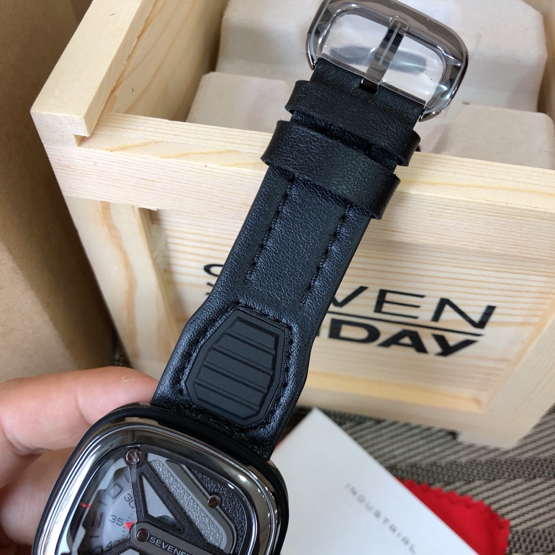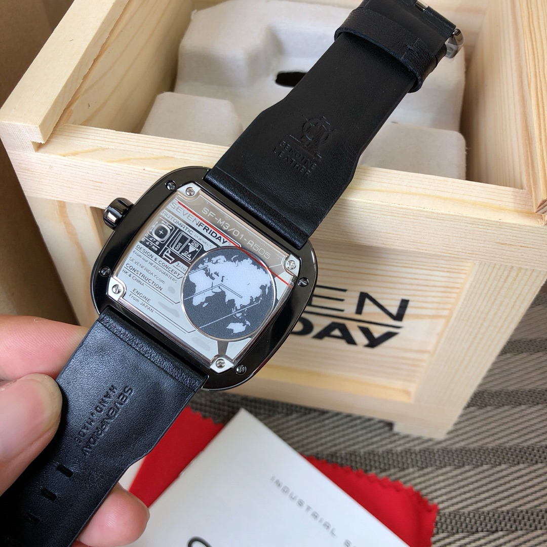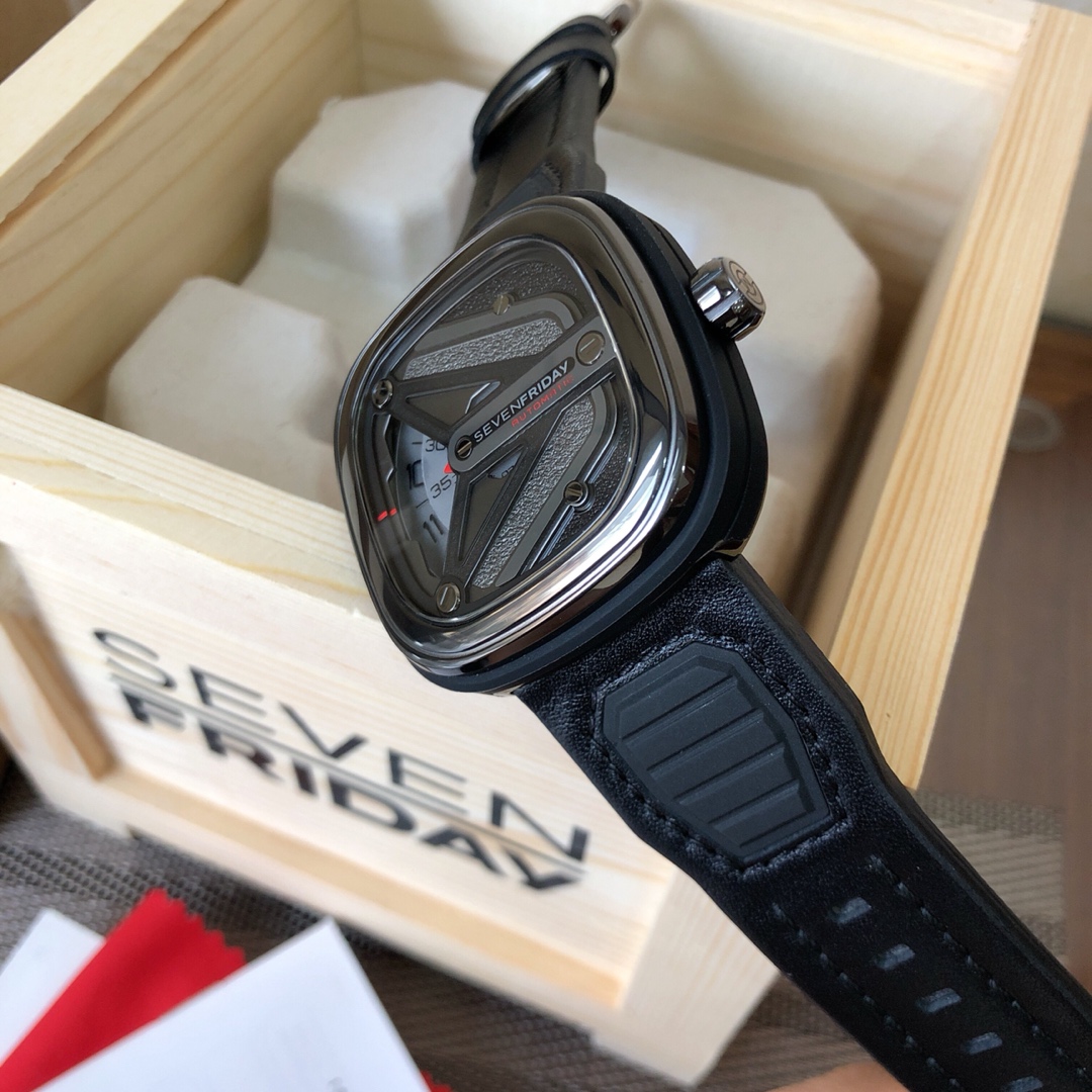 sevenfriday 七个星期五 太空飞船灵感牌自动机械表M3/01,拥有宇宙飞船的科技感,喷砂的黑色Y形船翼设计,形似起落架动态环,皮带具有三维效果的多级界面复古工业触觉感受,表盘运用11个部件7层界面,具有三维效果的多级界面,表壳边硅胶动态环,黑色Y形展示重叠的三个时间圆盘,左边时盘,右边分盘,中间秒盘!