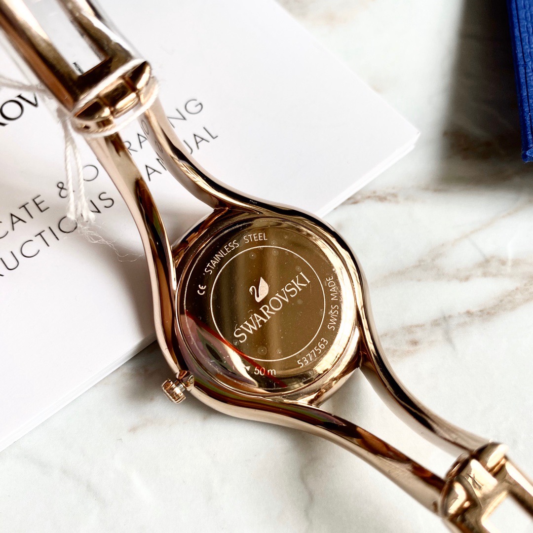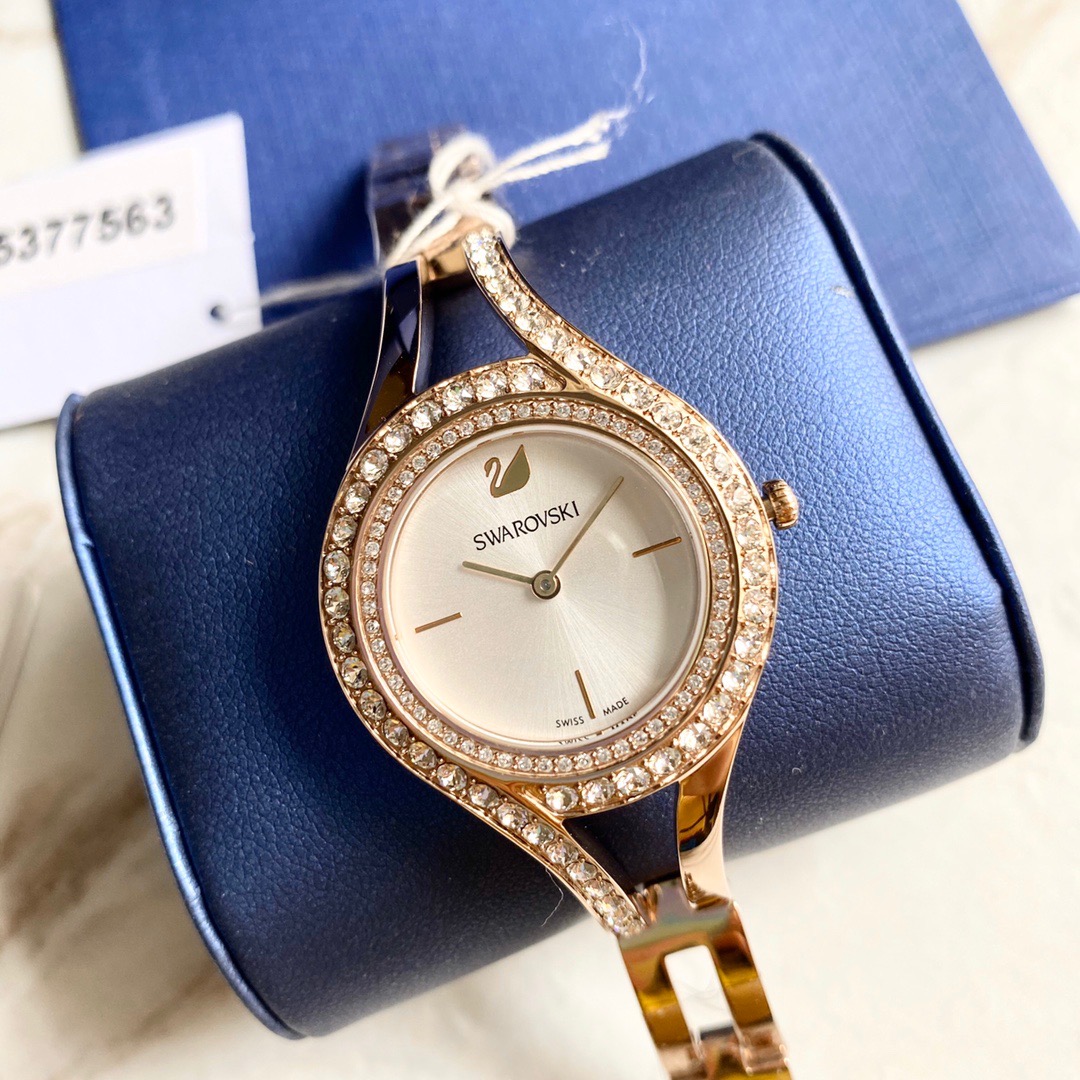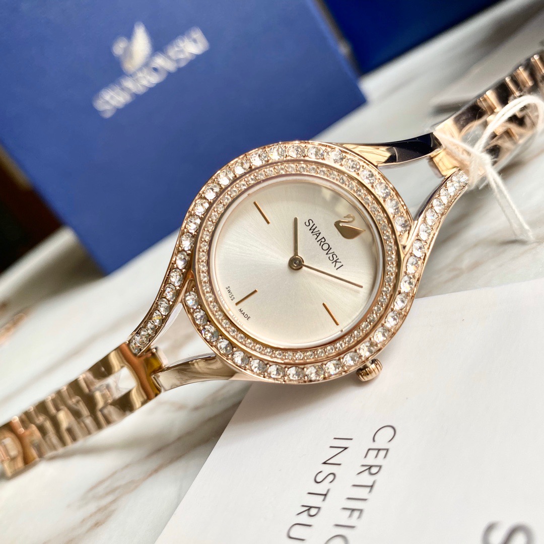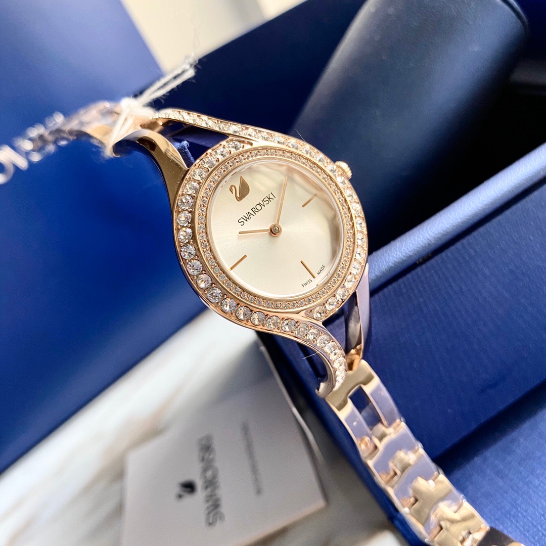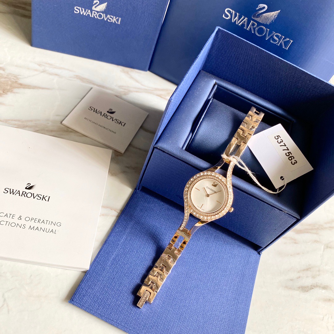 施华洛世奇/Swarovski(Eternal 系列) 这款线条流丽,现代感十足的腕表提升您的夏日造型!表圈上缀有两行密镶Swarovski仿水晶,加上不对称的装饰效果,展现清新典雅的光彩。而香槟金色表壳及表链与112颗透明Swarovski仿水晶,以及银白色放射线图纹表盘巧妙融合!