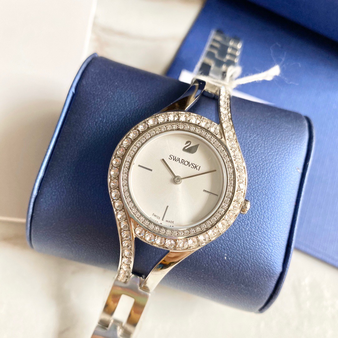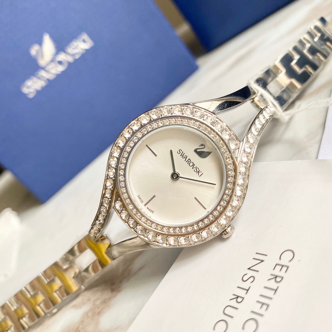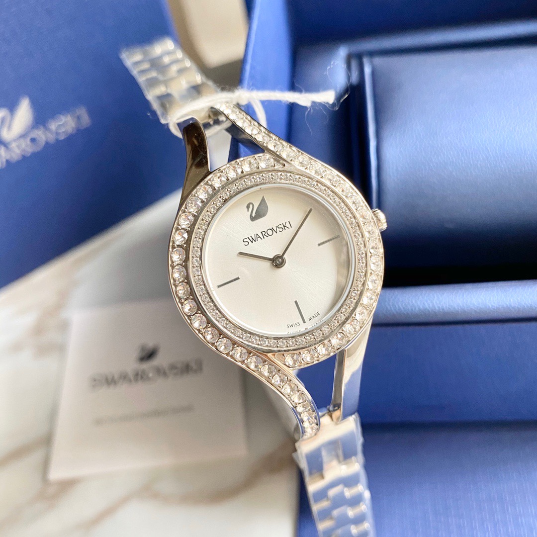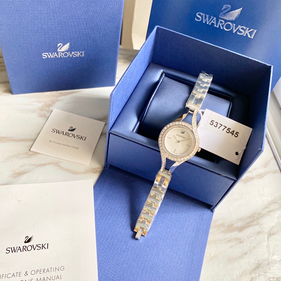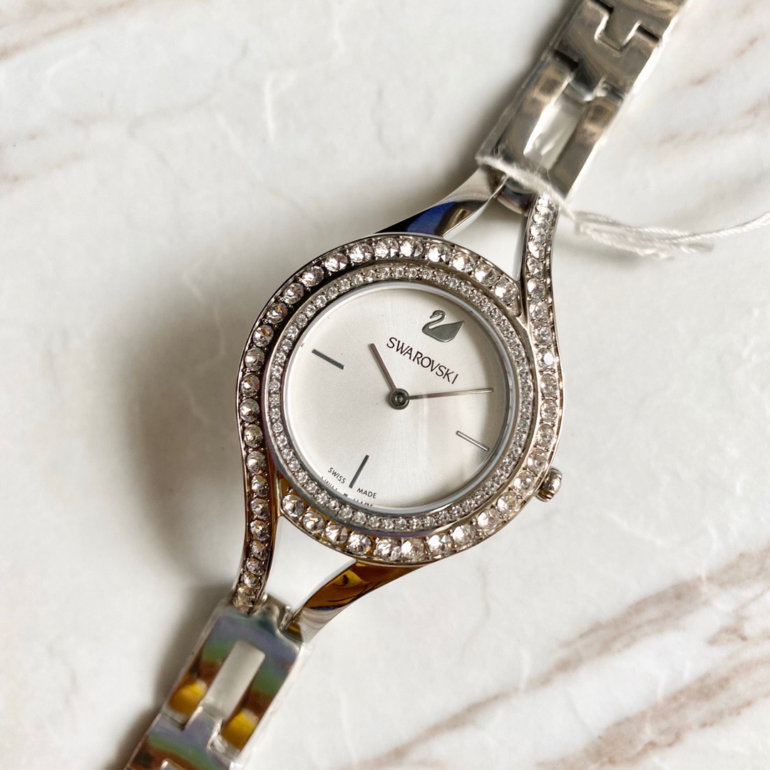 施华洛世奇/Swarovski(Eternal 系列) 这款线条流丽,现代感十足的腕表提升您的夏日造型!表圈上缀有两行密镶Swarovski仿水晶,加上不对称的装饰效果,展现清新典雅的光彩。而不锈钢表壳及表链与112颗透明Swarovski仿水晶,以及银白色放射线图纹表盘巧妙融合!