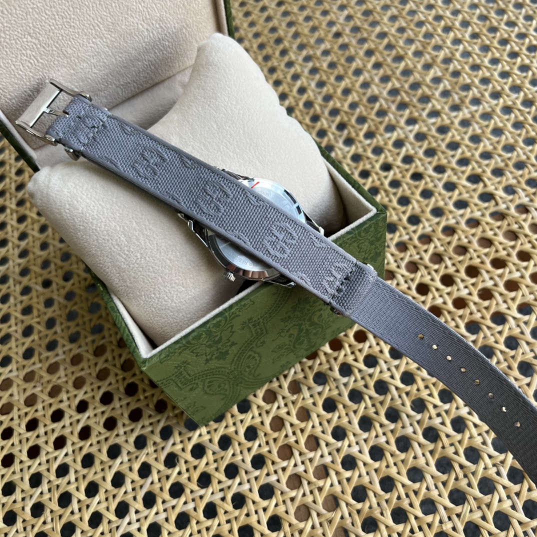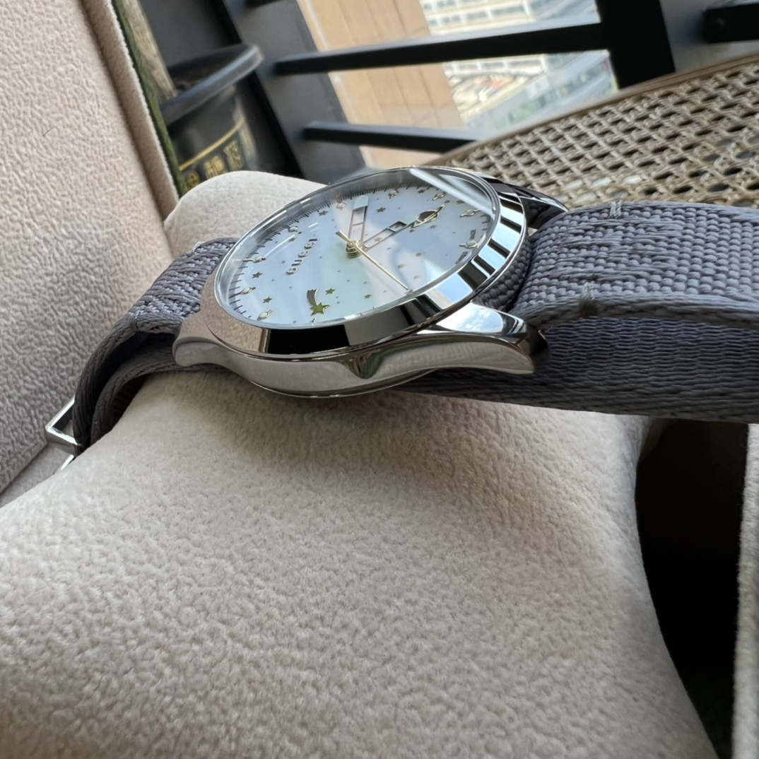 Gucci G-TIMELESS Gucci系列,中性表款,38mm表径,防眩目蓝宝石玻璃、316精钢表壳,双G刺绣尼龙表带,宇宙星空表盘设计,简洁大方,原装ETA机芯,全新全套出。