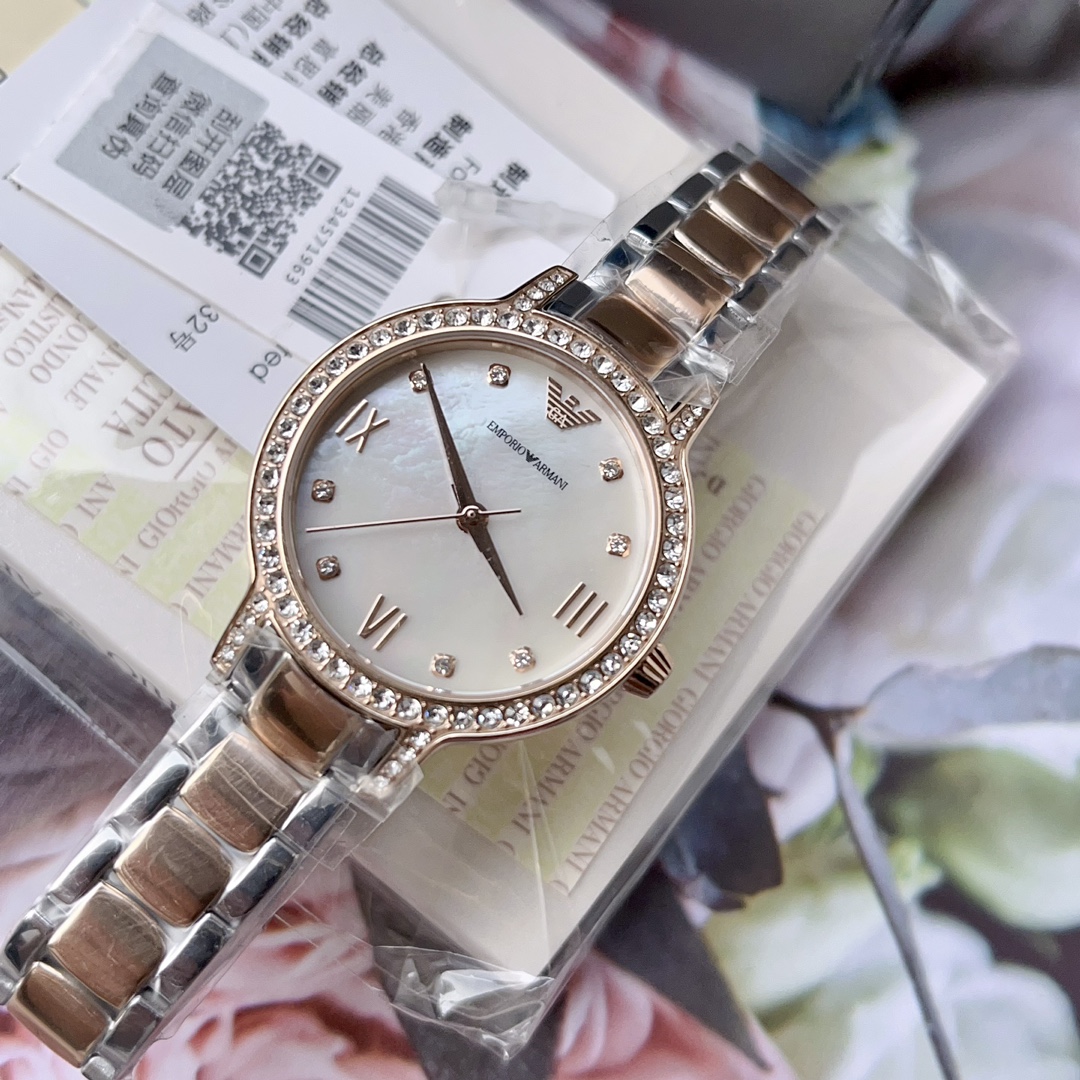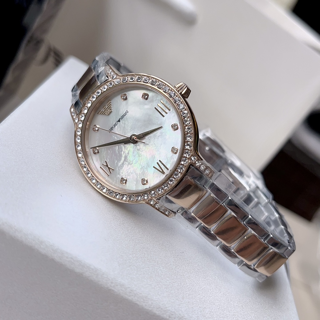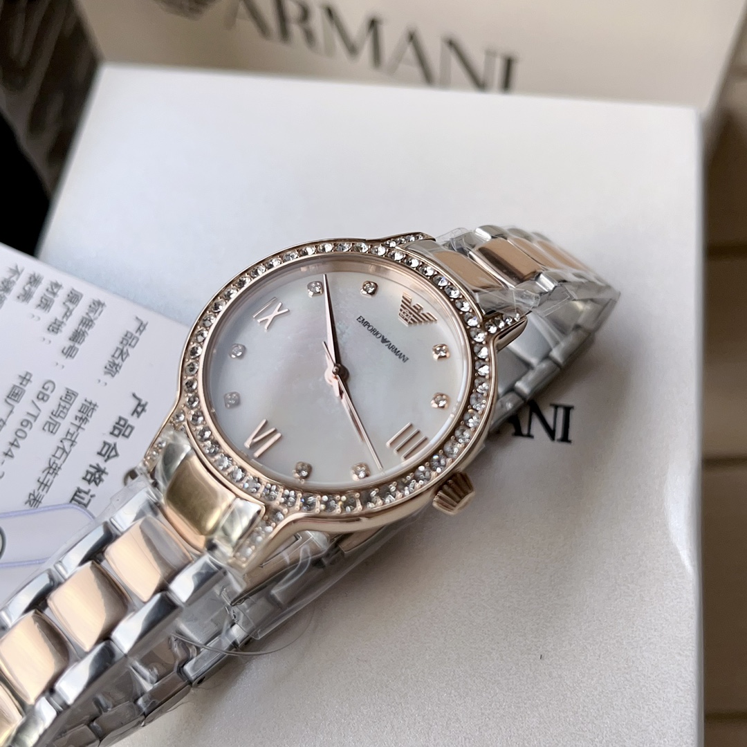 阿玛尼ARMANI女表,尺寸:32mm,是女生就永远抵挡不住圈钻的诱惑,带上手腕的一刻,眼神就半秒都不想离开,贝母盘永远的天花板,天空之镜,心向往之。