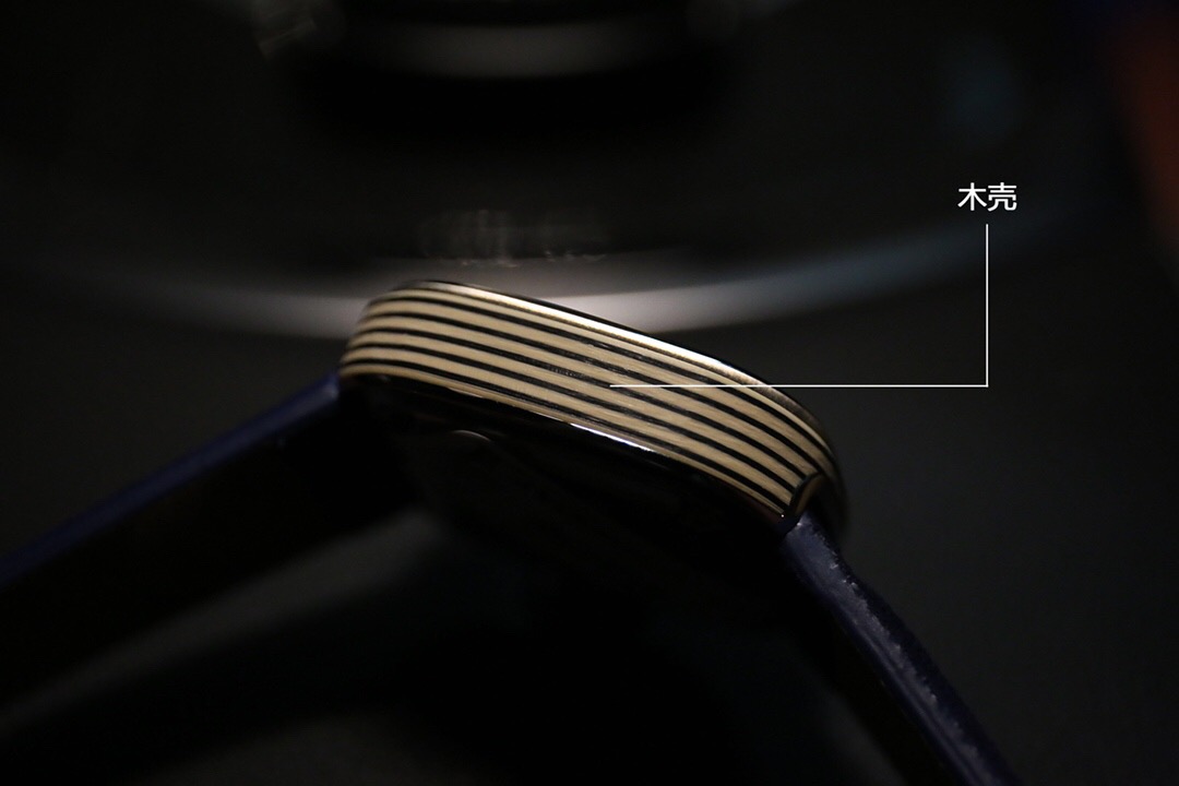 全新的视觉冲击与佩戴体验,船木甲板风格木质动态环充满海风气息,海锚形状的时间标识与罗盘形状的表盘,象征蔚蓝大海的蓝色小羊皮表带;