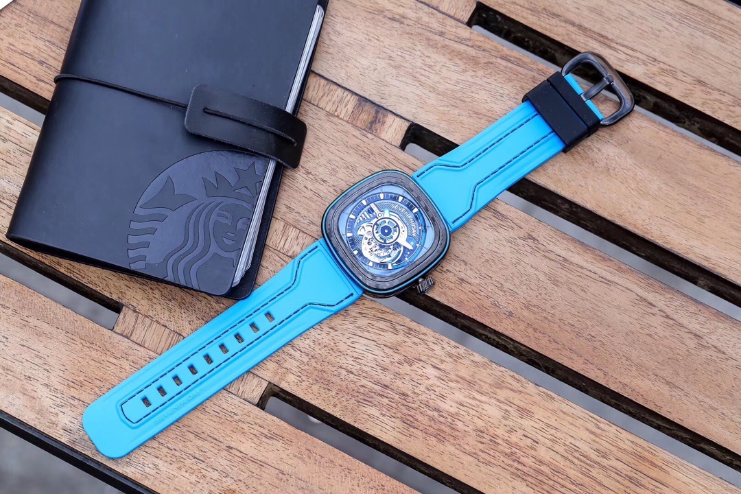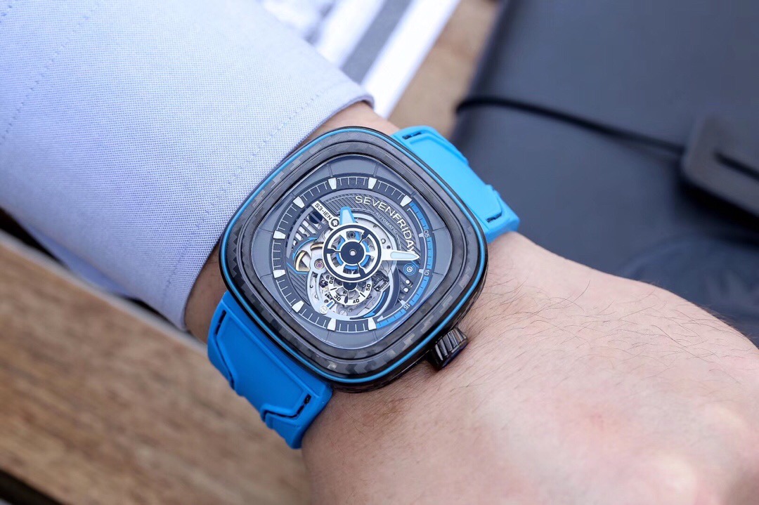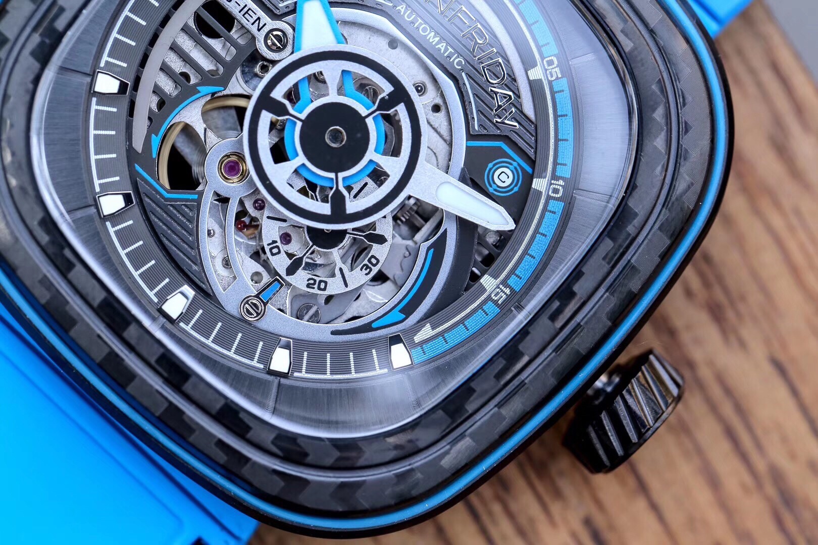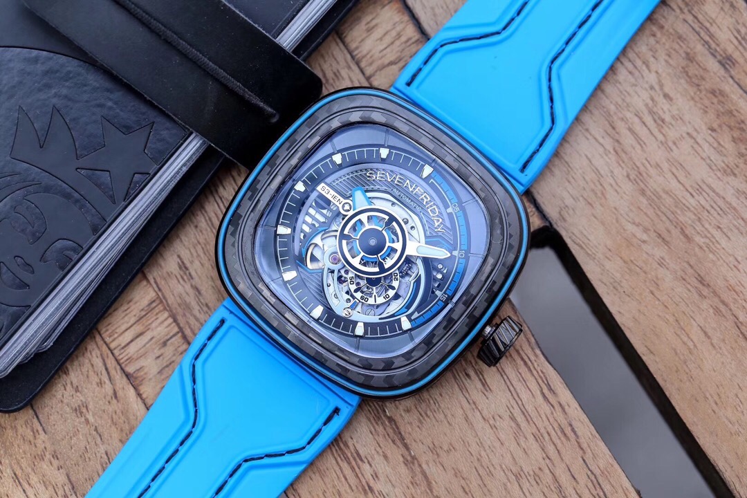 七个星期五-SevenFridayS3/02,sevnefriday最新与知名汽车改装专家所推出S3/02,表盘中央设计时、分指针,时针外圈饰以电关蓝色,分针为银色,指针白色部分为夜光涂层;