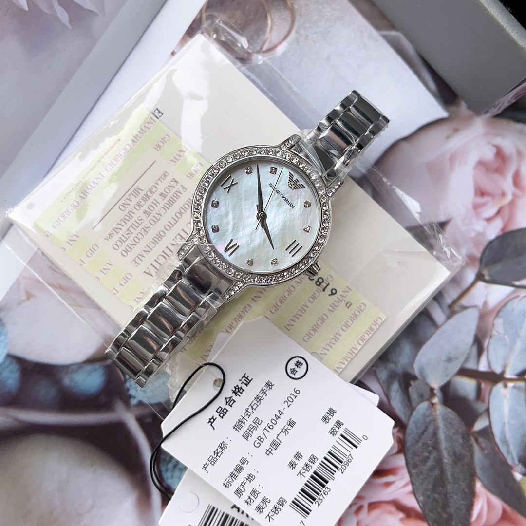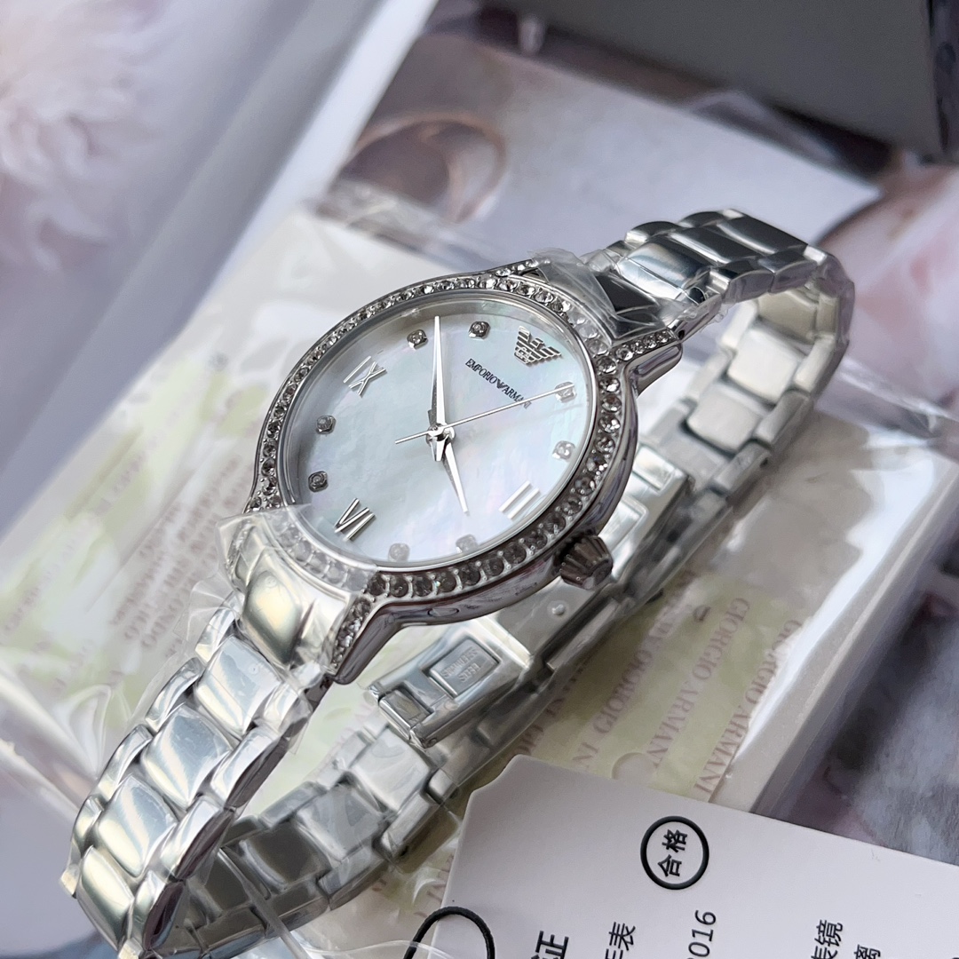 阿玛尼ARMANI女表,尺寸:32mm,是女生就永远抵挡不住圈钻的诱惑,带上手腕的一刻,眼神就半秒都不想离开,贝母盘永远的天花板,天空之镜,心向往之。